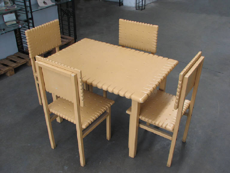 tavolo in legno con ripiano a forma di biscotto e n° 4 sedie con sedute e spalliere a forma di biscotto.Vassoietto sempre a forma di biscotto con al centro la scritta : L.U.-Petit Beurre-Nantes