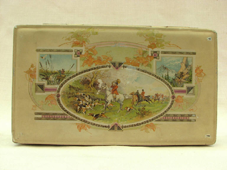 trattasi di una scatola metallica a forma di parallelepipedo, con coperchio , serigrafata con disegni vari su tutti i lati ad eccezione della base d'appoggio.Il motivo principale disegnato sul coperchio è rappresentato al centro da una scena di cacciatori a cavallo con cavallerizzo con tromba e cani in corsa.Ai lati della scena centrale cacciatori in barca in uno stagno da una parte e alpinisti in montagna dall'altra.Sulle fiancate altre scene di sport.