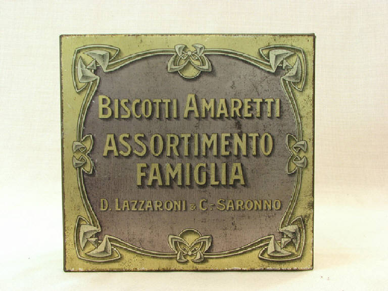trattasi di una scatola metallica a forma quasi qyadra, con coperchio , serigrafata con disegni vari su tutti i lati ad eccezione della base d'appoggio.Il motivo principale disegnato sul coperchio è rappresentato da una cornice a forma quadrangolare di volute con scritta all'interno del contenuto per famiglia e del fabbricante.