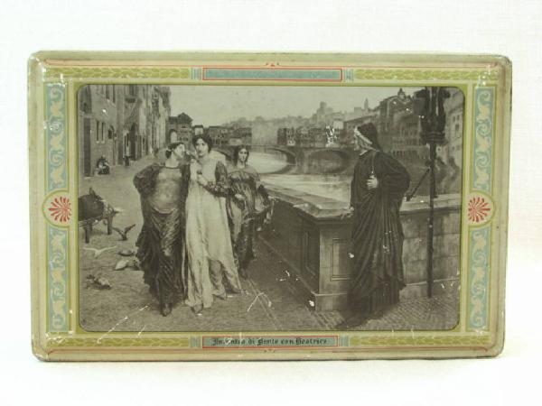 trattasi di una scatola metallica a forma di parallelepipedo, con coperchio , serigrafata con disegni vari su tutti i lati ad eccezione della base d'appoggio.Il motivo principale disegnato sul coperchio è rappresentato da una scena a Firenze nei pressi di un ponte sull'Arno in cui Dante incontra Beatrice accompagnata da due donzelle