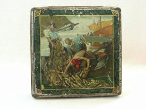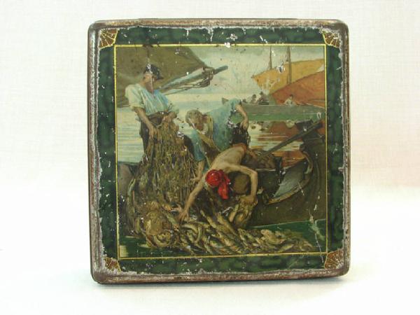 trattasi di una scatola metallica a forma quadrata con coperchio , serigrafata con disegni vari su tutti i lati ad eccezione della base d'appoggio.Il motivo principale disegnato sul coperchio è rappresentato da una scena di pesca in cui tre pescatori su una barca a vela stanno tirando su' una rete piena di pesci