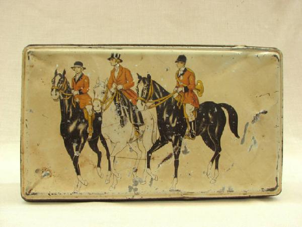 trattasi di una scatola metallica a forma di parallelepipedo, con coperchio , serigrafata con disegni vari su tutti i lati ad eccezione della base d'appoggio.Il motivo principale disegnato sul coperchio è rappresentato da tre cacciatori a cavallo