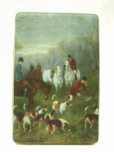 trattasi di una scatola metallica a forma di parallelepipedo, con coperchio , serigrafata con disegni vari su tutti i lati ad eccezione della base d'appoggio.Il motivo principale disegnato sul coperchio è rappresentato da cavvlieri e amazzoni sui cavalli che rovistano nel bosco con cani in cerca della preda