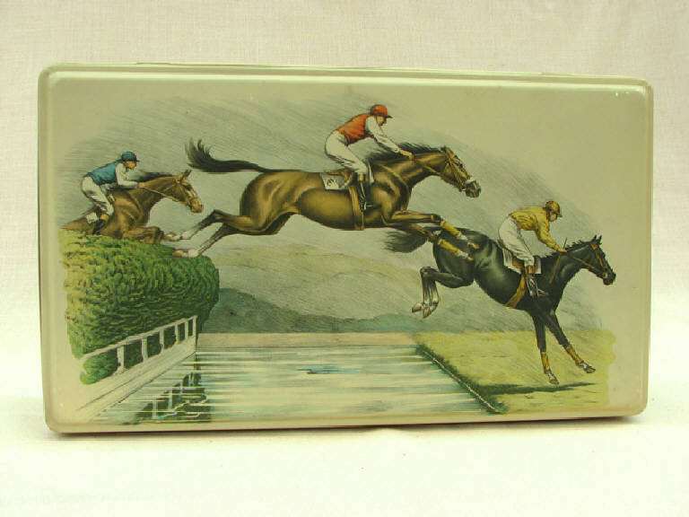 trattasi di una scatola metallica a forma di parallelepipedo, con coperchio , serigrafata con disegni vari su tutti i lati ad eccezione della base d'appoggio.Il motivo principale disegnato sul coperchio è rappresentato da tre cavalieri a cavallo che saltano l'ostacolo di una siepe e di un guado.