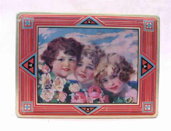 trattasi di una scatola metallica a forma di parallelepipedo, con coperchio , serigrafata con disegni vari su tutti i lati ad eccezione della base d'appoggio.Il motivo principale disegnato sul coperchio è rappresentato dal viso di tre fanciulle.