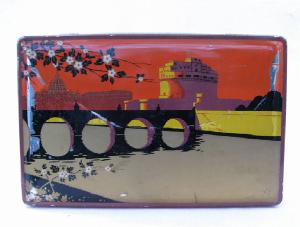 trattasi di una scatola metallica a forma di parallelepipedo, con coperchio , serigrafata con disegni vari su tutti i lati ad eccezione della base d'appoggio.Il motivo principale disegnato sul coperchio è rappresentato dal ponte che attraversa il Tevere all'altezza di Castel Sant'Angelo con quest'ultimo sullo sfondo.