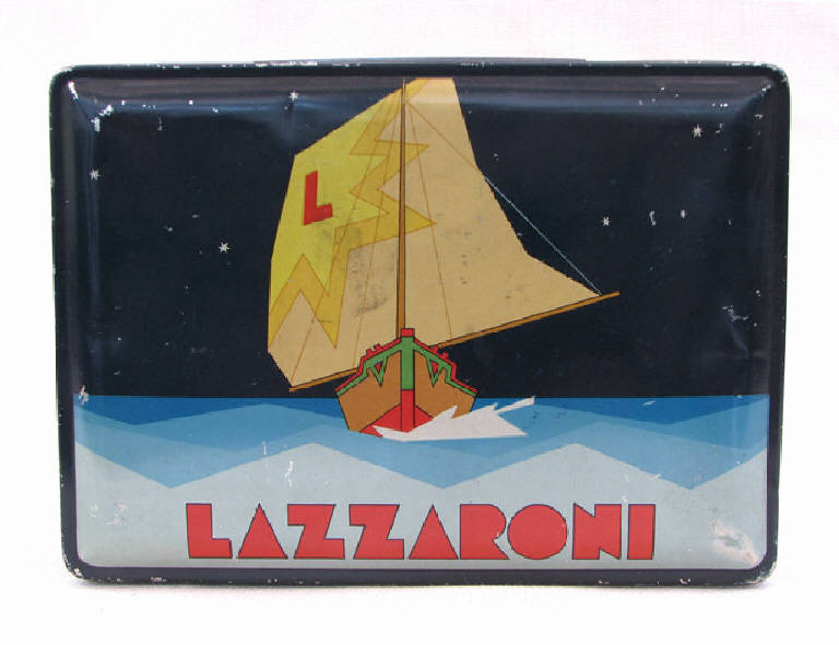 trattasi di una scatola metallica a forma di parallelepipedo, con coperchio , serigrafata con disegni vari su tutti i lati ad eccezione della base d'appoggio.Il motivo principale disegnato sul coperchio è rappresentato da una barca a vela sul mare