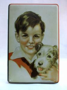 trattasi di una scatola metallica a forma di parallelepipedo, con coperchio , serigrafata con disegni vari su tutti i lati ad eccezione della base d'appoggio.Il motivo principale disegnato sul coperchio è rappresentato da un ragazzo con cane