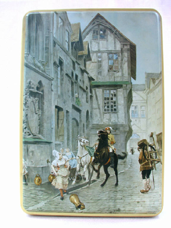 trattasi di una scatola metallica a forma di parallelepipedo, con coperchio , serigrafata con disegni vari su tutti i lati ad eccezione della base d'appoggio.Il motivo principale disegnato sul coperchio è rappresentato da un arrotino con gli attrezzi in spalla che incrocia un cavaliere che fa spaventare delle fanciulle con delle brocche d'acqua