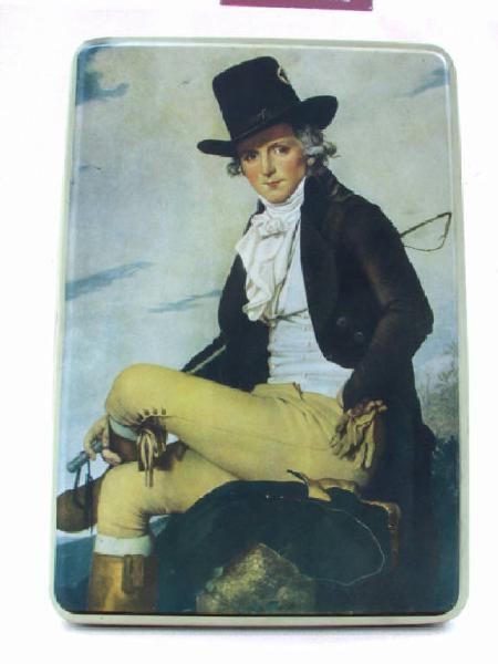 trattasi di una scatola metallica a forma di parallelepipedo, con coperchio , serigrafata con disegni vari su tutti i lati ad eccezione della base d'appoggio.Il motivo principale disegnato sul coperchio è rappresentato da " Il Cavaliere di Bretagna "