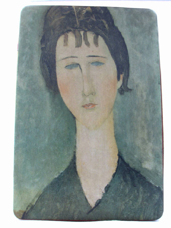 trattasi di una scatola metallica a forma di parallelepipedo, con coperchio , serigrafata con disegni vari su tutti i lati ad eccezione della base d'appoggio.Il motivo principale disegnato sul coperchio è rappresentato da un ritratto di donna di Amedeo Modigliani