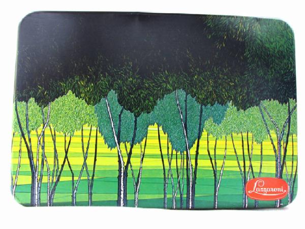 trattasi di una scatola metallica a forma di parallelepipedo, con coperchio , serigrafata con disegni vari su tutti i lati ad eccezione della base d'appoggio.Il motivo principale disegnato sul coperchio è rappresentato da alberi con sfondo giallo di Mario Rossello