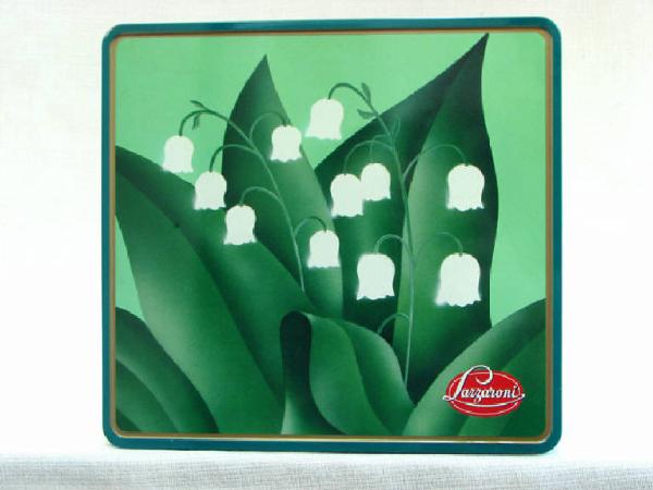 trattasi di una scatola metallica a forma quadrata, con coperchio , serigrafata con disegni vari su tutti i lati ad eccezione della base d'appoggio.Il motivo principale disegnato sul coperchio è rappresentato da una composizione floreale