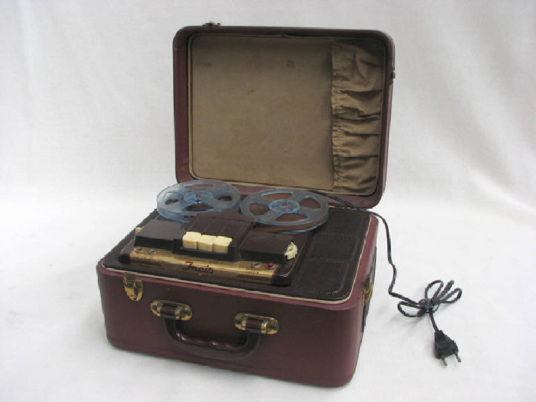 Magnetofono costituito da una valigia in legno ricoperto in pelle marrone sulle pareti esterne e in pelle scamosciata beige all'interno del coperchio.\nIl coperchio è incernierato sul fondo ed è apribile dopo aver sbloccato i due dispositivi laterali. All'interno del coperchio sono inserite due tasche.\nFrontalmente, sulla base, è inserita una maniglia in plastica per il trasporto.\nNella base sono inseriti il motore, i circuiti di funzionamento del magnetofono e l'altoparlante. La faccia superiore della base è costituita da una griglia in metallo nella quale è inserito il dispositivo d'uso. Questo è costituito due fusi con inserite due bobine di nastro magnetico e i comandi d'uso: un selettore per la modalità d'uso registrazione/riproduzione, tre tasti per avanzamento veloce/riavvolgimento veloce/arresto del nastro, il potenziometro per la regolazione del volume, tre boccole per il collegamento in ingresso di microfono/radio/pick-up e in uscita di cuffie, una spia di indicazione di funzionamento.\nIl nastro magnetico scorre tra le testine di registrazione e riproduzione.\nDal retro fuoriesce il cavo di collegamento alla rete elettrica.\nSotto alla base è inserita una griglia di aerazione per il raffreddamento dei circuiti e un commutatore per la selezione della tensione di alimentazione.\nLateralmente è posizionato l'altoparlante protetto da una griglia in plastica.