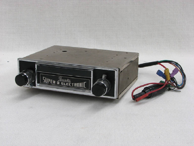 Apparecchio squadrato in metallo.\nAll'interno dell'apparecchio sono inseriti i circuiti di funzionamento del radioricevitore, il motorino per il trascinamento del nastro. Dal retro fuoriescono i cavi di connessione agli altoparlanti, alla batteria dell'autoveicolo, la messa a terra.\nSulla parete frontale è inserita un mascherina in metallo sulla quale si trovano il vano in cui si inserisce la cassetta Stereo 8 a nastro magnetico, la scala di sintonia del radioricevitore (valori illeggibili) e i relativi comandi. Il vano porta cassetta è protetto da uno sportellino apribile e all'interno sono visibili i dispositivi che permettono l'avanzamento del nastro magnetico (in particolare il fuso in cui si inserisce la bobina contenuta nella cassetta) e la testina.\nAi lati della mascherina sono inseriti due potenziometri doppi che permettono accensione e regolazione del volume e regolazione dei toni, sintonia della frequenza radio e bilanciamento delle uscite destra e sinistra.\nUn'etichetta posta inferiormente riporta gli schemi elettrici dei collegamenti ad altoparlanti, batteria, ecc.\nCaratteristiche tecniche:\nalimentazione 12 V cc negativo a massa\nvelocità nastro 9,5cm/s\nmotore stabilizzato elettronicamente\nimpedenza d'uscita 4 Ohm\npotenza d'uscita 7+7W