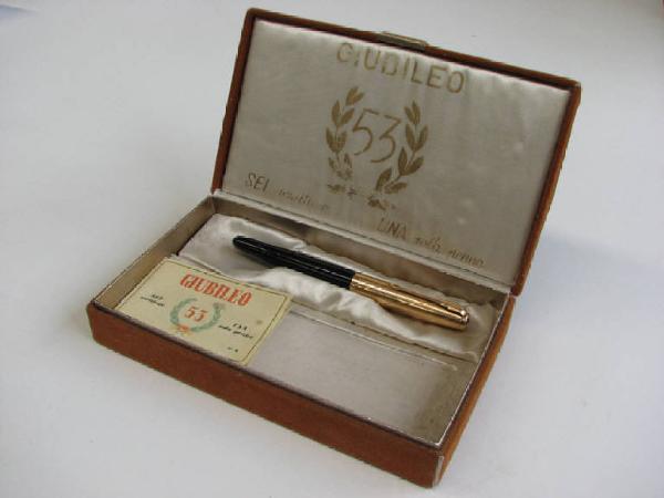 Penna stilografica in nylon nero con cappuccio laminato in oro con fermaglio. Il pennino in oro 14Kt con punta osmiridio fuoriesce solo parzialmente dalla penna. La parte terminale della penna può ruotare per permettere la regolazione del flusso di inchiostro. La penna può essere svitata e separata in due parti. Aprendola si può estrarre il serbatoio dell'inchiostro (ricaricabile) nel quale sono inseriti da una parte il pennino su un supporto in plastica nera e dall'altra il pistone in alcatene azionato ruotando la parte posteriore della penna.\nSono inoltre presenti due scatole in cartone di cui una ricoperta in finta pelle verde scuro con interno in velluto dello stesso colore e l'altra ricoperta in velluto marrone chiaro e interno in raso bianco. All'interno della scatola la penna poggia in una apposita scanalatura.\nIn una delle scatole è presente il certificato di garanzia con le istruzioni per il riempimento della penna.
