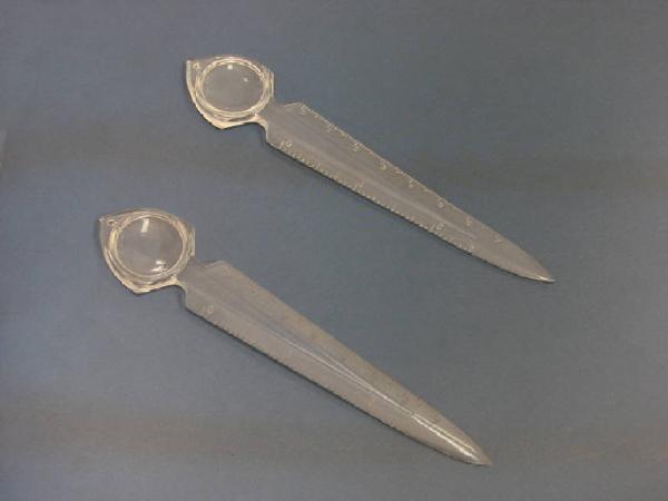 Tagliacarte in plastica trasparente con un'estremità appuntita e l'altra di forma triangolare arrotondata. Lungo i lati della punta sono stampate due scale di misura una con indicazioni numeriche da 0 a 7cm e tacche ogni millimetro e l'altra con indicazioni numeriche da 0 a 2 pollici e tacche ogni decimo di pollice. Nell'estremità più allargata è inserita una lente di ingrandimento sempre in plastica trasparente.
