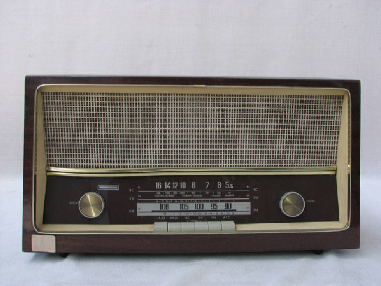 Apparecchio radio da tavolo in legno di forma parallellepipeda poggiante su quattro piedini.\nNella parte alta della parete frontale troviamo due altoparlanti e nella parte bassa i comandi per l'accensione e la sintonizzazione.\nLa rotella di sinistra permette l'accensione e la regolazione del volume, la rotella di destra è il comando di sintonia e permette di selezionare la frequenza desiderata che viene letta sul quadrante inserito tra le due rotelle. Sul quadrante si trovano tre scale di lettura: una per BC con indicazioni numeriche da 16 a 5,5 Kc, una per SW con indicazioni numeriche in Mc da 1600 a 550 o da 16mBAND a 49mBAND o da 18 a 6, una per FM con indicazioni numeriche da 108 a 88 Mc.\nNella parte bassa del profilo dell'apparecchio sono inseriti cinque pulsanti per le selezioni: jazz, bass, BC, SW, FM, AFC.\nLa parete posteriore è mancante.\nAll'interno sono visibili le 4 valvole, il circuito supereterodina e gli altoparlanti.\nSono inoltre presenti alcune prese per il collegamento di apparecchiature esterne e cavo di alimentazione.