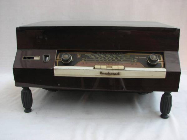 Questo radiofonografo ha l'aspetto di un mobiletto in legno di forma trapezoidale, poggiante, dalla parte anteriore, su due piedi.\nLa parte superiore presenta uno sportello apribile all'interno del quale è inserito il giradischi.\nIl giradischi è costituito da un piatto girevole ed un'asta rotante sulla quale è collocata la puntina.\nUna rotella permette di selzeionare la velocità di rotazione del piatto per dischi a 33, 16, 45, 78 giri.\nE' presente un adattatore in plastica per l'inserimento dei dischi a 45 giri. Sono inoltre presenti due dischi 45 giri.\nSulla parete frontale, inclinata per comodità d'uso, si trova invece l'apparecchio radio con tasti per la selezione delle modalità d'uso, due rotelle per l'accensione e la regolazione del volume e dei toni e per la sintonia delle frequenze e una scala di sintonia luminosa.\nLa scala di sintonia è inserita in un quadrante sul quale sono indicate le località, i metri (da 200 a 550 per le onde medie e da 20 a 50 per le onde corte), le frequenze per i canali FM da 86 a 104MHz.\nI tasti per la selezione delle modalità d'uso prevedono: F (fonografo), OM, OC, FM, TV (ricezione canale audio televisivo).\nDi fianco alla scala di sintonia si trovano l' indicatore visivo di sintonia "occhio magico" e una pulsantiera a tre tasti parzialmente rotti (commutatore di gamma).\nLateralmente sono inseriti tre altoparlanti circolari magnetodinamici, ricoperti da una rete in tessuto e da una griglia in plastica.\nDal retro fuoriescono il cavo elettrico per il collegamento alla rete, l'antenna AM e i connettori per l'antenna FM.\nLa parete posteriore è apribile e all'interno sono visibili le valvole, il circuito supereterodina, gli altoparlanti e il meccanismo di funzionamento del fonografo.