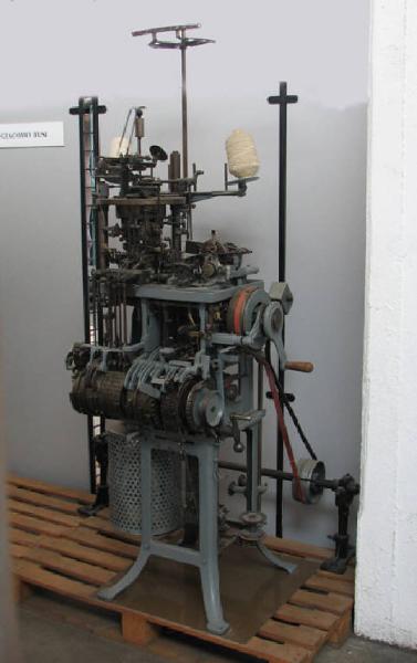 Macchina in metallo funzionante mediante puleggia collegata ad un sistema di trasmissione che era probabilmente collegato ad un motore. Sulla puleggia si ha anche una manovella in legno e metallo. Nella parte alta si trovano due rocchetti di filato posti su un sostegno che comprende anche dei fori nei quali passa il filo prima di inserirsi nei tendi filo. Il filato passa poi in un cilindro costituito da 212 aghi mossi da un sistema ad aste collegato con la puleggia mediante un albero motore.\nNella parte anteriore è inserito un cilindro con fori e relative spinette, probabilmente utilizzati come guida filo per la formazione dei disegni.\nDall'interno del cilindro di aghi fuoriesce la calza che, una volta terminata, viene stirata passando tra due rulli e lasciata cadere in un cilindro raccoglitore.\nCaratteristiche tecniche: finezza 18x33/4 (diametro cilindro), numero aghi 212.