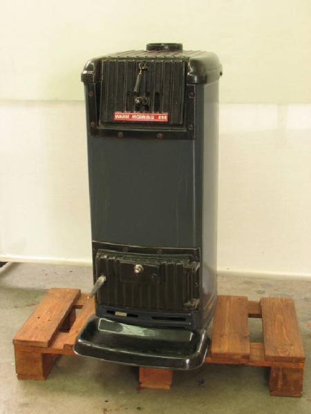 Stufa in ghisa di forma parallelelpipeda. Nella parte anteriore, in basso, è inserito una sportello con maniglia incernierato sul lato e apribile per l'inserimento del carbone. Sullo sportello è inserita una finestrella con sportello apribile. Davanti allo sportello è presente una vschetta in ferro per raccogliere eventuali fuoriuscite di carbone.\nSempre sulla parete frontale, am nella parte superiore è presente un altro sportello, incernierato nella parte bassa ed apribile a compasso con finestrella scorrevole. Allo sportello è appesa un maniglia in bachelite da tirare per l'apertura. Nella parte superiore è inserito l'attaccco per il tubo di scarico dei fumi della combustone.