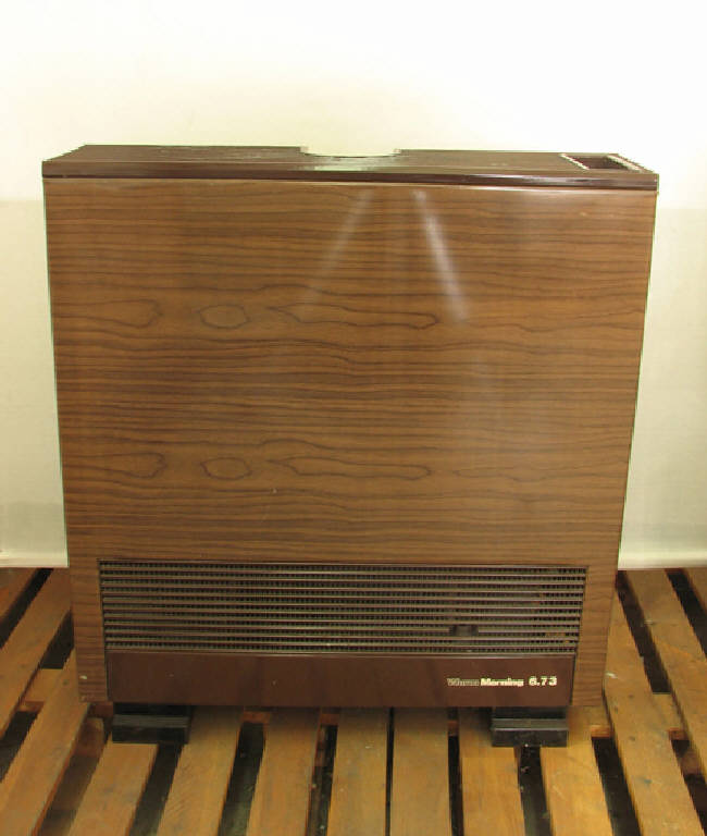 Stufa in metallo di forma parallelepipeda a sviluppo orizzontale. Nella parte bassa è inserito il bruciatore ad accensione elettrica automatica con i relativi ugelli.\nLa parte bassa della parete frontale è grigliata come il piano superiore.\nSul lato destro della parete superiore sono inseriti i comandi di accensione e regolazione (tasto del piezoelettrico, tasti per accensione spegnimento, manopola per la regolazione dell'intensità di fuoriuscita del gas). Al centro della parete superiore è presente il foro d'innesto del tubo per gli scarichi della combustione.\nSul retro si trova il rubinetto con valvola di sicurezza per il collegamento alla rete del gas.