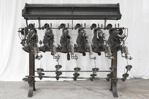 Macchina a 6 teste con supporto in basso per le rocche di partenza (due per ogni cono che si va ad avvolgere) e piano in alto per collocare i coni già realizzati. Un sistema di passafili e pettini mantengono la giusta tensione ai filati. Etichetta: "Tessilmeccanica Lombarda di G.Barbier - Milano, Via Lazzaretto14 - Missaglia".