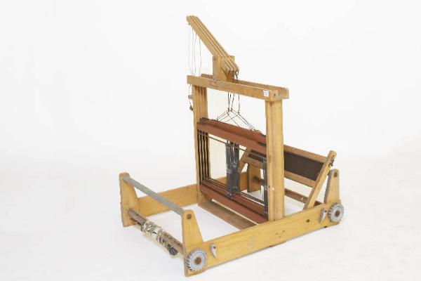 Lo strumento è formato da due parti che si montano ad incastro, creando un telaio completo. A: struttura del telaio, con subbio anteriore e posteriore e pettine pettine battitrama; B: struttura verticale con 4 licci e relativi comandi a cordicella.