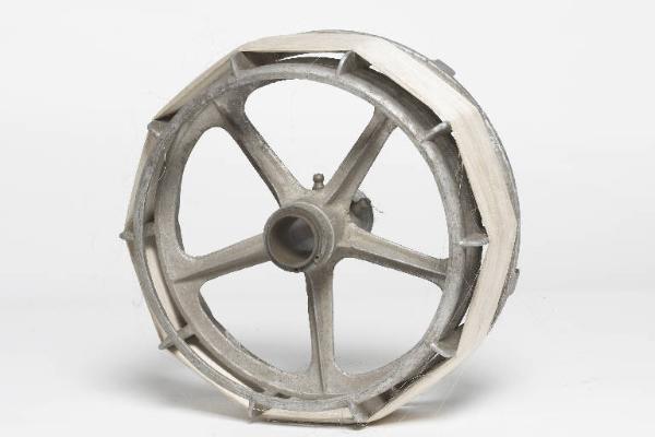 L'oggetto completo è formato da un aspino circolare, a 5 raggi interni (A) e da una speciale rocchella con anima di legno e flange metalliche (B)