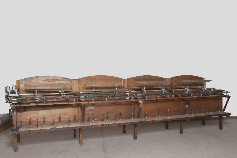L'oggetto completo è costituito da diverse parti. (A):banco di aspatoia a 4 sezioni e 32 posizioni (si possono avvolgere contemporaneamente fino a 8 matasse per ognuna delle 4 sezioni, corrispondenti ad un aspo), senza motore, con contagiri (recente) fissato all'estremità sinistra e con un asse (recente) dotato di mollette porta-tubetto, appoggiato al piano su cui in origine appoggiavano semplicemente le rocche. (B-C-D-E-F-G-H-I-L-M): aspo a sei appoggi (n°10); (N) n°1 tubetto cartone "Ritorcitura Butti"; (O) rocchetto flangiato anima legno (scatola, serie, n°38); (P) rocchetto flangiato anima legno, come prec. (cassa legno, serie, n°100)