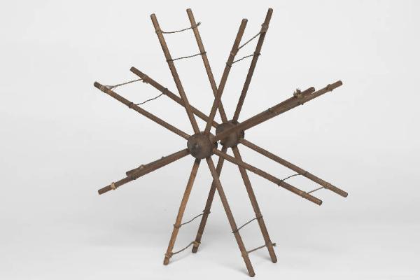 Aspino a 8 appoggi. L'oggetto è formato da una coppia di dischi centrali, brevemente distanziati da un perno, da ciascuno dei quali si dipartono 8 bacchette. Si ottiene in tal modo una struttura a coppie di raggi, legati fra loro alle estremità da un filo di ferro e da un cordino, con funzione di appoggio della matassa. L'ampiezzaa dell'aspo è quindi regolabile regolando la posizione del cordino
