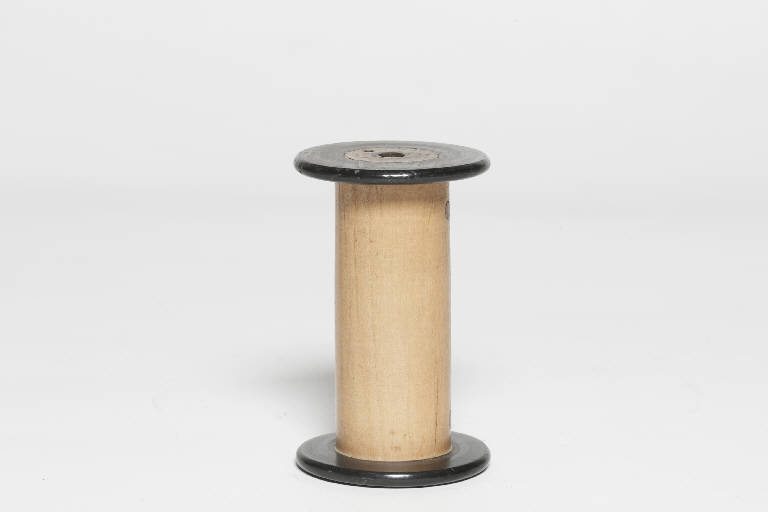 Rocchetto con anima in legno e flange in materiale sintetico. Possiede un canale passante lungo l'asse, per il posizionamento sul fuso del filatoio. I 2 oggetti della serie sono singolarmente contrassegnati con lettere da A e B