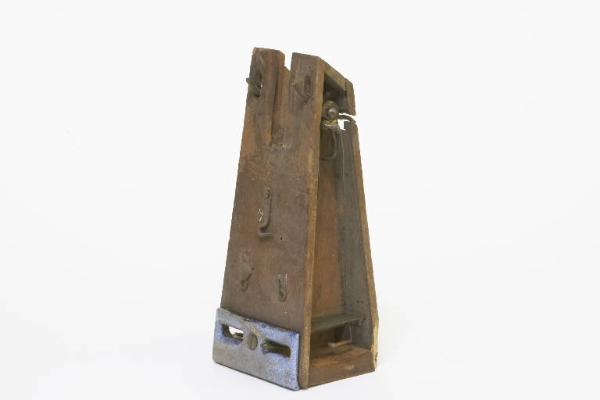 Cassetta di legno per binatrice, di forma trapezoidale, con meccanismo cascafilo in filo metallico. (Per binatrice simile a INVN: 00159)