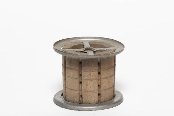 Rocca formata da due parti: un'anima interna in metallo che si prolunga in due flange forate, ed un rivestimento esterno dell'anima, in legno, scanalato e forato