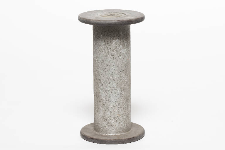 Rocchetto con anima in materiale sintetico rivestito di metallo cromato e flange in materiale sintetico. Su una flangia: "M.Scaglia Spa - Brevettato 1960"