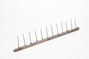 Supporto formato da un listello di legno con infissi equidistanti lunghi pioli per l'alloggiamento di rocche, probabilmente su un'aspatrice. A: supporto per 12 rocche; B: supporto per 12 rocche; C: supporto per 5 rocche