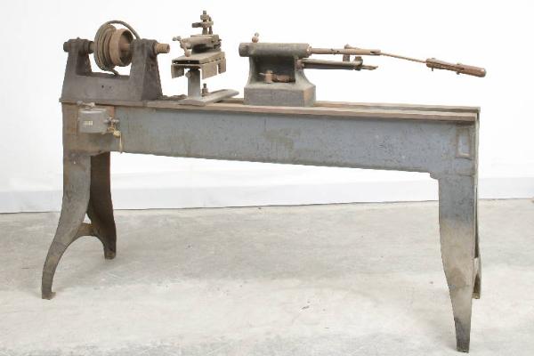 La macchina è costituita da una base in ghisa, su cui sono montati i due supporti per il fissaggio del pezzo da tornire, collegati all'asse motore. Un'etichetta metallica porta i dati del costruttore: "Brevettata Officina Meccanica Achille Sabadini - Olginate (Como)"
