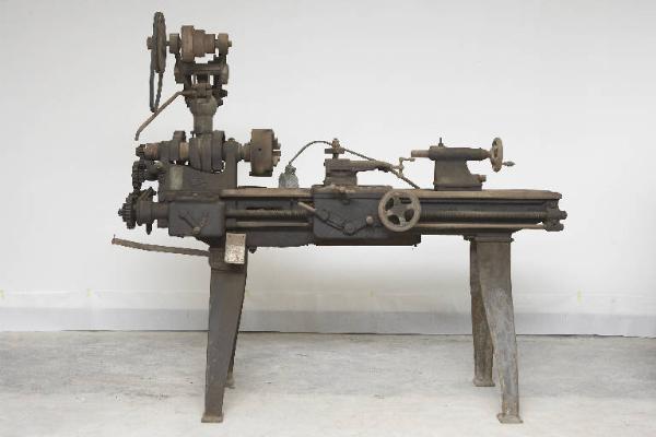 La macchina è costituita da una base in ghisa, su cui sono montati i due supporti per il fissaggio del pezzo da tornire, collegati all'asse motore. Una piastra fusa applicata porta i dati del costruttore: "Morini & Bossi - Via Manzoni 31 - Milano - Macchine utensili motori a benzina". Un'etichetta metallica a pplicata vicino a questa porta i valori di una "tabella per filettatura". Una piccola lampada con fusto flessibile è stata aggiunta alla macchina