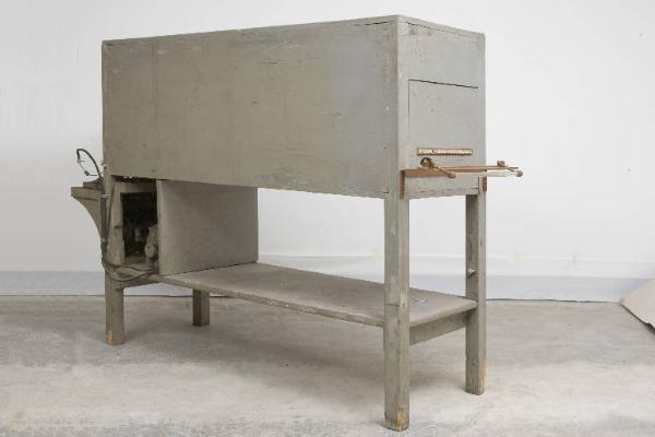 L'apparecchio è costituito da un cassone in legno sostenuto da 4 gambe, apribile con un portello sul lato lungo. Lungo i due lati corti, vicino alla base del cassone, una stretta fenestratura rettangolare ospita un listello di legno che porta una fila di anelli passafilo in porcellana bianca. La base del cassone è foderata internamente di tessuto tipo feltro.