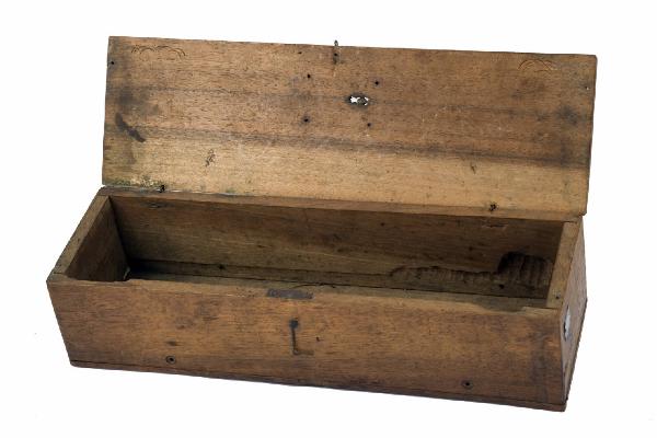 Semplice scatola di legno composta mediante assemblaggio di piccole assi squadrate con incastro a coda di rondine. Coperchio apribile per mezzo di cerniera ad anelli in ferro sul lato lungo. Chiusura ad anello su lato opposto con gancio a "L" posto sul fronte esterno. Sul coperchio si intravede scritta su più righe e numero posto in alto a destra. All'esterno, sul lato sinistro, si leggono cifre intervallate da barra. Sul fondo si trovano: un chiodo pertinente, quattro viti, tre piedini in rame. Sul lato sinistro si trovano un foro passante circolare e, alla base, tre fori quadrangolari occlusi da carta. Sul coperchio, in basso a sinistra, si individua etichetta di carta.