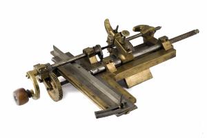 Macchina di notevoli dimensioni. Struttura portante di ferro e ottone. Azionamento a manovella, associata a ingranaggio dentato, dotata di braccio curvo a sezione quadrangolare terminante con pomolo ligneo con supeficie liscia. Guide-supporto fisse e scorrevoli montate sugli alberi principali della macchina. Fissaggio in posizione per mezzo di viti di differente tipo: con testa perpendicolare, a testa piatta ellittica, a testa circolare con profilo zigrinato. Supporto per l'uso in morsa.