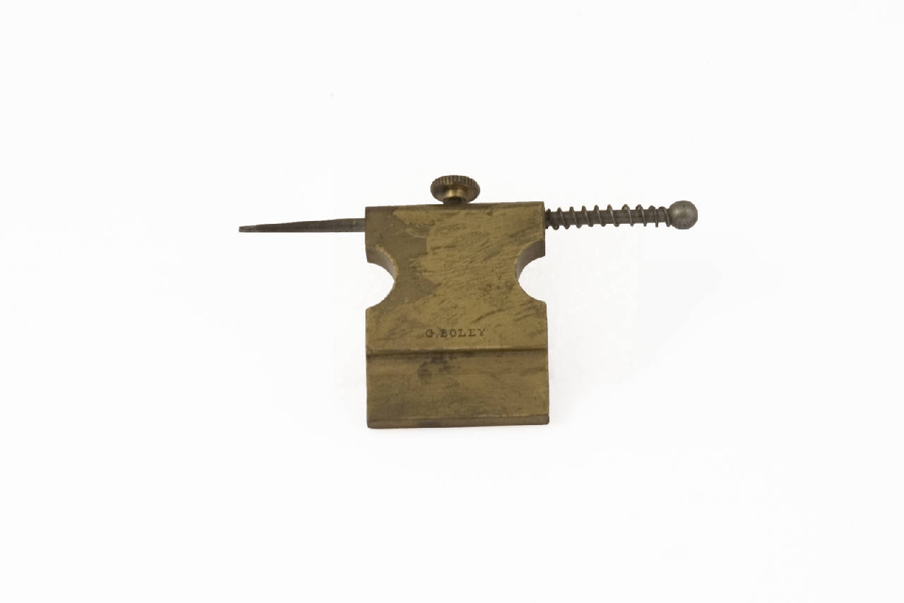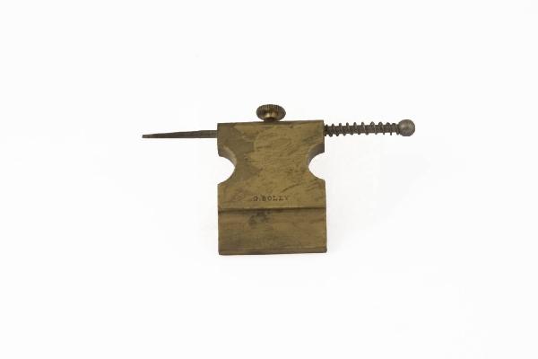 Guida di ottone, a lamina piatta, sagomata sui due lati. Nella parte superiore traversata da asta di ferro appuntita, fermata in posizione da vite con testa circolare piatta con profilo zigrinato. Da inserire entro supporto. Nome inciso su un lato.