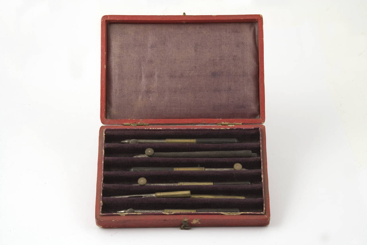 L'astuccio ligneo conserva al suo interno utensili di metallo depositati entro sei appositi alloggiamenti paralleli. Interamente dipinta di rosso, la custodia ha coperchio bombato con etichetta cartacea centrale applicata, ellittica con margine a punte continue, riportante scritta relativa al contenuto. É apribile mediante cerniera posta su uno dei lati lunghi e unico gancio centrale metallico su quello opposto. Interno rivestito di tessuto.
