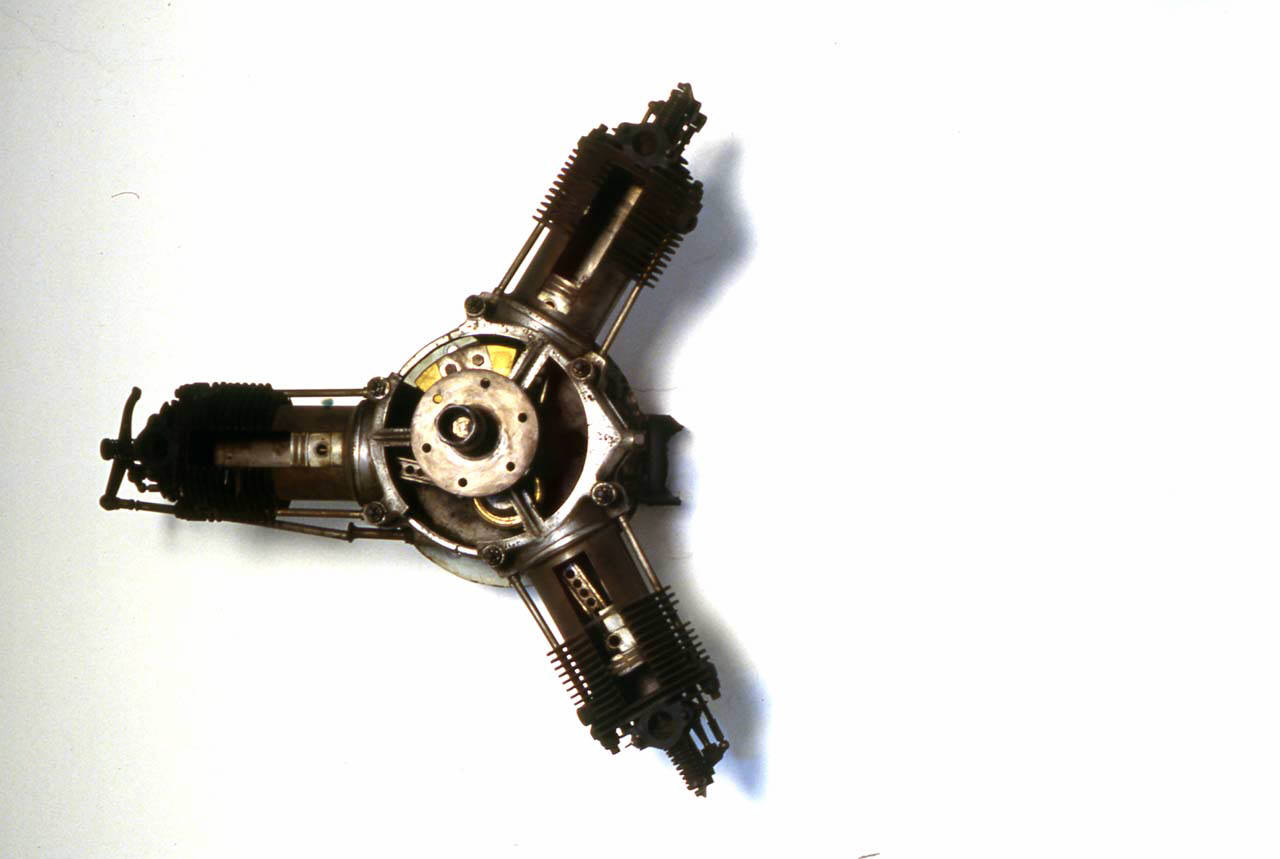 Motore a 3 cilindri disposti a Y, raffreddato ad aria. La superficie esterna dei cilindri presenta un'alettatura per il raffreddamento. I cilindri e il carter sono stati parzialmente sezionati a scopo didattico.
