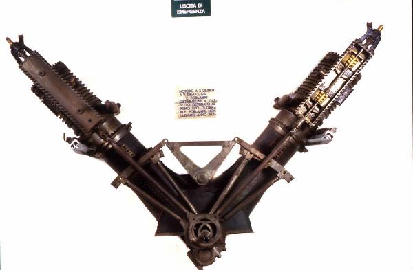 Motore a vapore a 2 cilindri disposti a V di 90° invertita. I cilindri sono sorretti da un'incastellatura di lamiera d'acciaio con funzione di carter e chiusa mediante numerosi bulloni lungo le giunture. Le superfici esterne dei cilindri presentano dieci alette di raffreddamento. Il motore presenta una distribuzione a cassetto, comandata ad eccentrici; il cassetto di distribuzione sinistro, mancante del coperchio, mostra l'otturatore a scorrimento piano rettilineo.