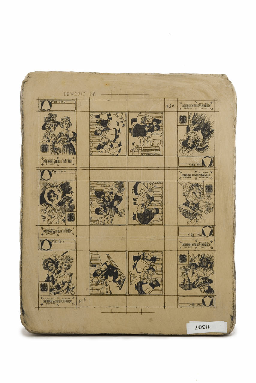 Pietra calcarea con superficie levigata e pareti ruvide. La superficie liscia è litografata. La pietra è sistemata su un espositore in legno.\nLa superficie litografata è suddivisa il 12 riquadri delle dimensioni delle etichette per le scatole di fiammiferi per le quali venivano stampate.\nLe immagini rappresentano giovani donne e bambini che giocano nella neve.