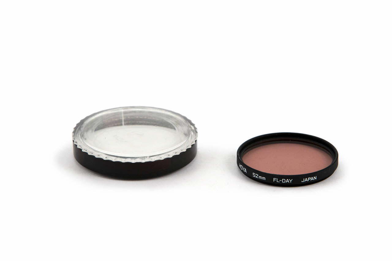 Filtro fotografico di forma circolare con lente rosa montata su telaio in metallo.\nInserzione a vite davanti all'obiettivo.\nIl filtro è custodito in una scatola circolare in plastica nera con coperchio trasparente a pressione e poggia su un'imbottitura in materiale plastico bianco.