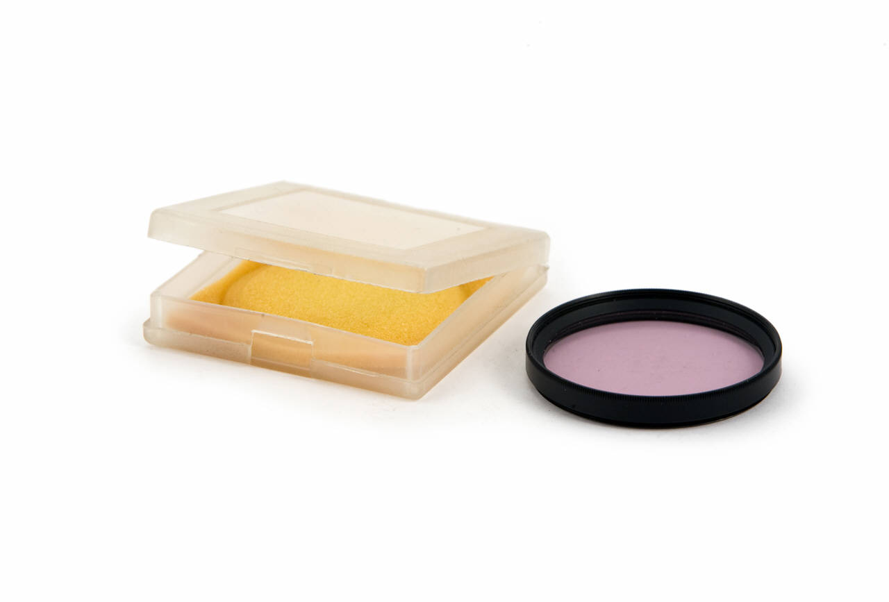 Filtro fotografico di forma circolare con lente rosa montata su telaio in metallo.\nInserzione a vite davanti all'obiettivo.\nIl filtro è custodito in una scatola quadrata in plastica con coperchio e poggia su un'imbottitura in gomma piuma.