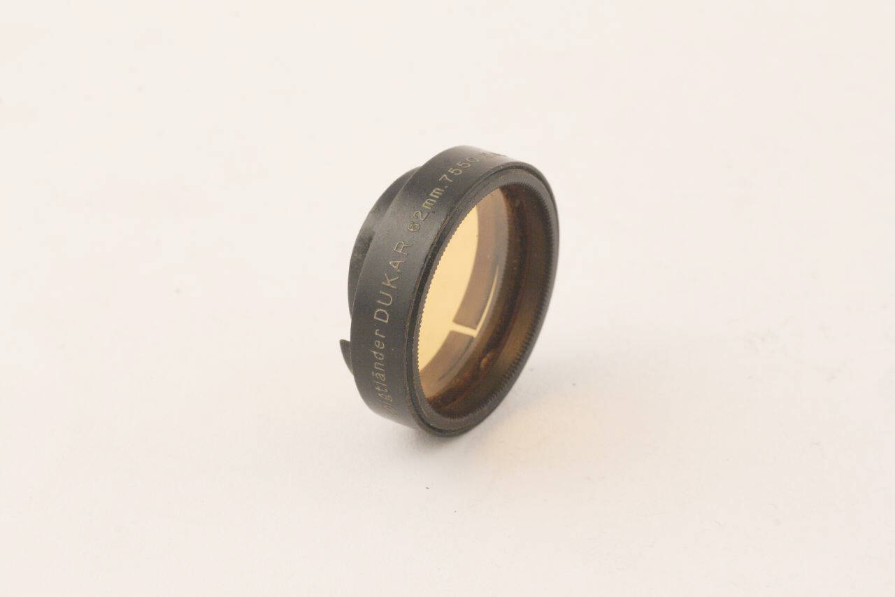 Filtro fotografico di forma circolare con lente arancione. Inserzione a pressione davanti all'obiettivo.\nIl filtro è conservato in una custodia in pelle marrone con chiusura in metallo, tipo porta monete.
