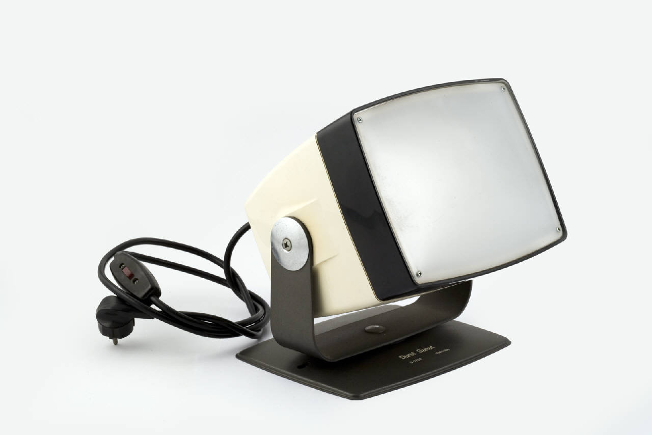 Lampada in plastica di forma trapezoidale fissata ad un sostegno snodato in metallo.\nDal retro della lampada fuoriesce il cavo di alimentazione per il collegamento alla rete elettrica, con interruttore di accensione e spina schuko.\nAll'interno, la lampada è posta dietro ad un piccolo schermo smerigliato circolare. Questo schermo è seguito da un imbuto riflettente coperto da una lamina rettangolare concava in plastica smerigliata.